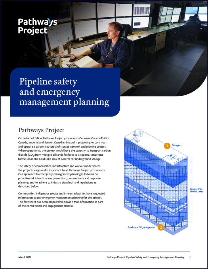 The proposed Pathways Project would transport captured CO2 from oil sands facilities to a deep sandstone formation in the Cold Lake area of Alberta. Safety of communities, infrastructure and workers is central to the project design, with emergency management planning focused on proactive risk identification, prevention, preparedness and response.